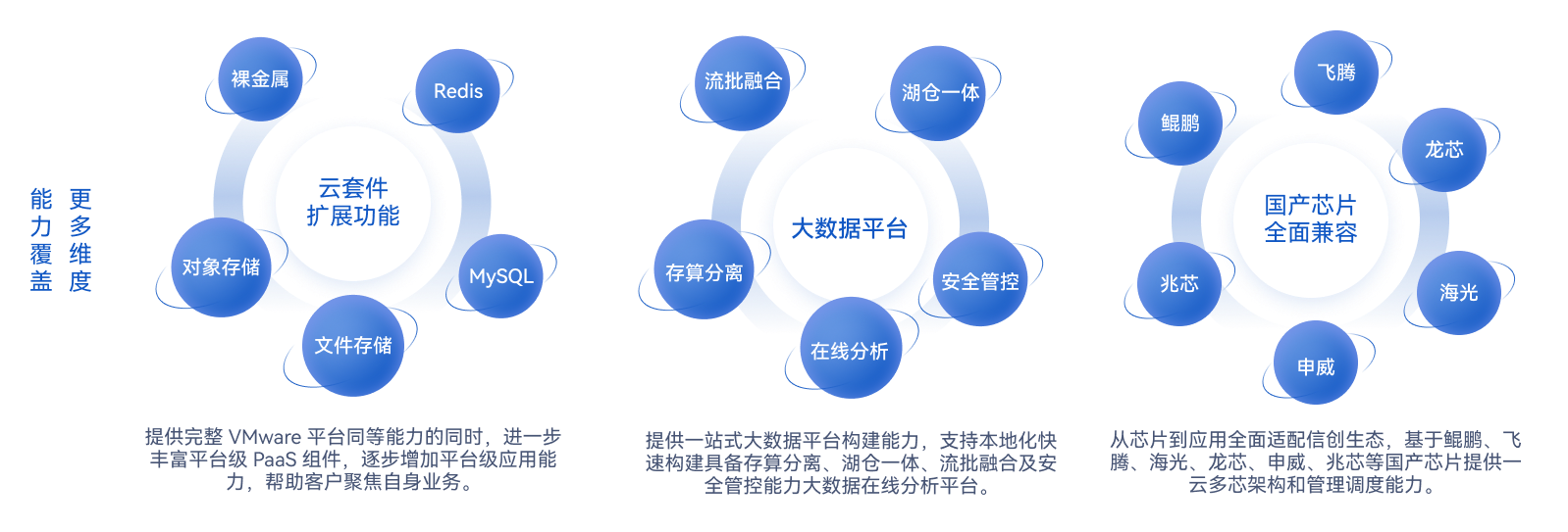 拥有完整的 VMware 替换方案,覆盖服务器虚拟化、超融合、私有云等主要场景的平替和升级能力。